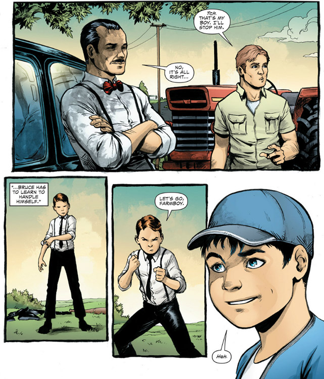 Alfred and Jonathan Kent watch on as young Bruce Wayne meets boy Clark Kent. From Batman/Superman #3 (2013); art by Yildiray Cinar.
