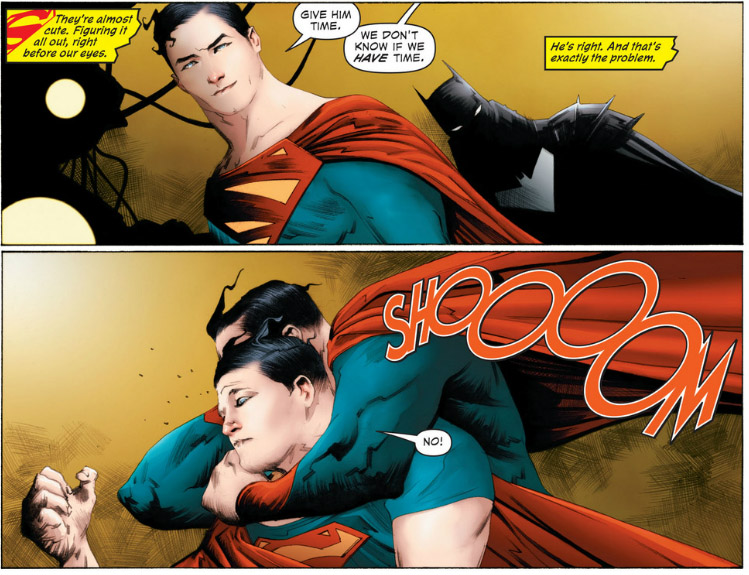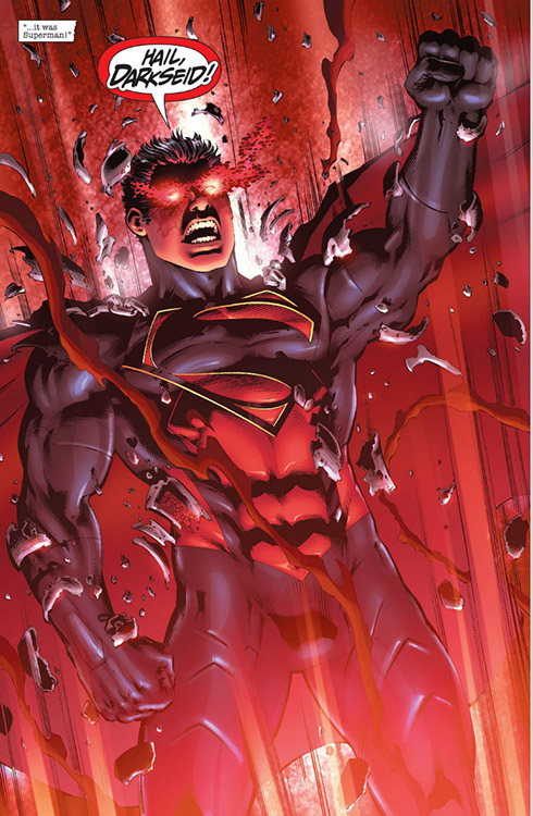 When Jonathan Kent ordered them to stop their fighting, Superman Prime was stunned. On his world, the Kents had died years earlier. Martha Kent calmed everyone down, and the Supermen returned to Metropolis. The Man of Steel used "Mangubots" to help protect the city. The Supermen met Lois Lane and Wonder Woman, who arrived on the scene and unexpectedly struck down Lois—she had been possessed by Kaiyo. (#2) Wonder Woman compelled Kaiyo to vacate Lois' body and she revealed that the heroes were being tested by Darkseid. The heroes learned that the government had been hiding an alien crystal that amplified energy. Kaiyo warned them that the crystal was their only hope in defeating Darkseid. (#3)
