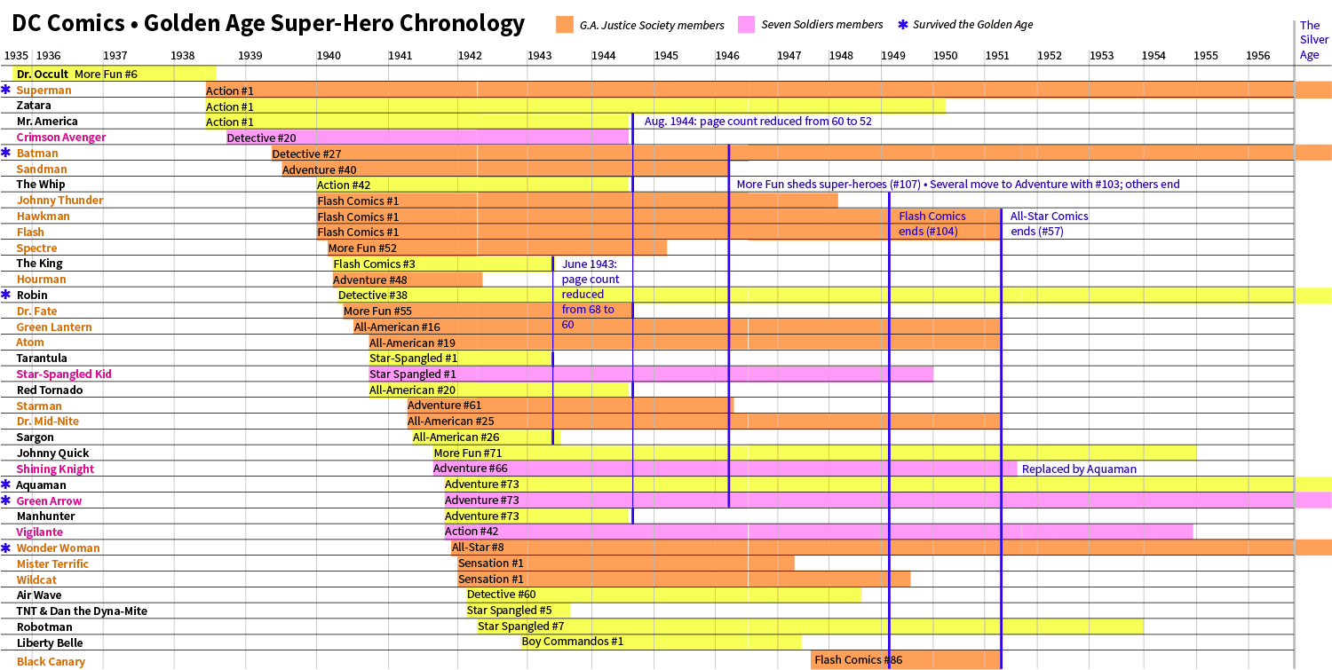 - In August 1944 issues, pages went from 60 to 52. One super-hero from every anthology was dropped: Crimson Avenger, Mr. America, the Whip, Dr. Fate, Red Tornado, and Manhunter.
