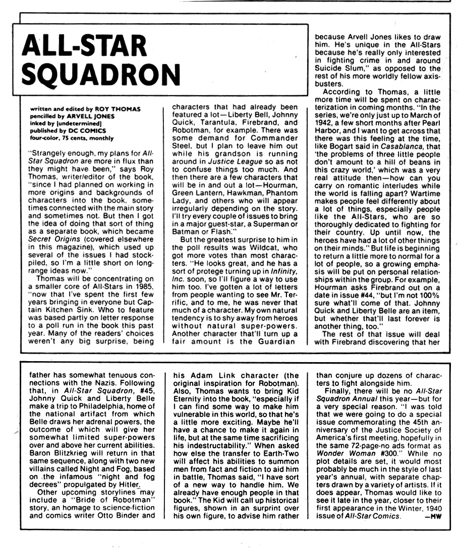 The fanzine Amazing Heroes published various "Preview Specials" that featured advance write-ups about comic book series. In five issues — Amazing Heroes #39 (Jan. 1984), Amazing Heroes #62 (Preview Special, Winter 1985), and Preview Specials #1-3 (Summer 1985, Winter 1986, Summer 1986) — Roy Thomas outlined some of his plans. Not all of them came to pass, and are interesting to note: