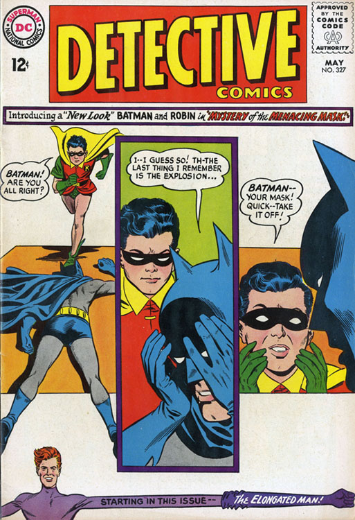 Another common misconception is that the Earth-One Batman always had the distinctive yellow oval around his chest emblem. In fact, even during the New Look period, the Batman titles explicitly stated that the new emblem was a recent costume change, not a retcon. This point is made most forcefully by a story in Batman #183 (Aug. 1966) in which a vengeful ex-con's attempt to impersonate Batman fails because his costume has the old emblem, an error the crook doesn't recognize because he was in prison when Batman adopted the newer insignia. Various flashbacks to the Earth-One Batman's early career (for example, in Batman #200, Mar. 1968, and #213, July/Aug. 1969, and World's Finest Comics #271, Sept. 1981) also indicate that he did not always have the yellow oval. Since the Earth-Two Batman never had the yellow oval, its presence in a Silver or Bronze Age story usually means the story took place on Earth-One, but the reverse is not necessarily true.
