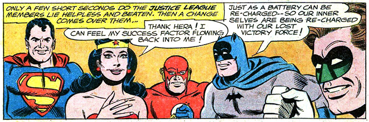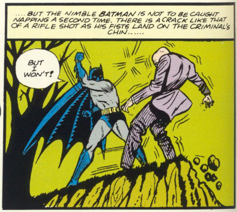 - He worried about his mental health. There was a lot of talk among fans in the late seventies and early eighties about whether or not Batman was insane, which, viewed in the light of later stories, seems rather quaint. The Earth-One Batman was always driven and usually serious (although he did have a sense of humor), but he only occasionally displayed the sort of grim, obsessive paranoia that became the post-Crisis Batman's stock in trade. When he did, it was usually in response to something specific — such as a particular case or particular enemy getting under his skin — and he often seemed legitimately concerned about the implications of those reactions. If wondering if you're going mad means you're probably not, the Earth-One Batman was a great deal healthier than his subsequent incarnations.