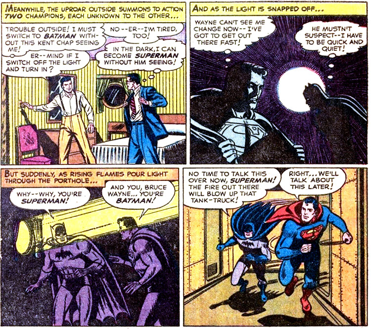 Many, though not all, of the Batman/Superman team-ups in World's Finest Comics (starting in #71, July/Aug. 1954) are almost certainly Earth-One stories. For example, the first of these, "Batman — Double for Superman" (World's Finest #71), deals with Batman and Robin's efforts to protect Superman's secret identity from a snooping Lois Lane, to whom the Earth-Two Superman was married by 1954. The villain of World's Finest Comics #88 (May/June 1957), #94 (May/June 1958), and #100 (Mar. 1959) is Earth-One's Lex Luthor and the latter story involves the Bottle City of Kandor (described as "Krypton City"), which, according to Showcase Comics #97 (Feb. 1978), did not exist on Earth-Two. However, the Club of Heroes seen in World's Finest #89 (July/Aug. 1957) probably did, since several of its members, such as the Knight and the Squire, had previously been introduced in stories that most likely took place on Earth-Two (e.g., Batman #62, Dec. 1950/Jan. 1951).