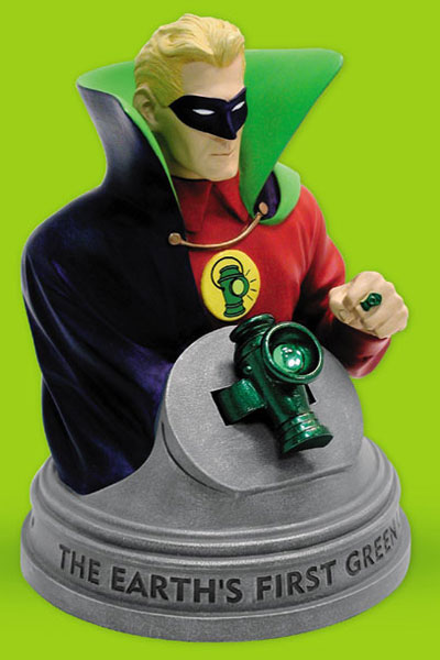 Alan Scott Green Lantern Power Ring Replica The original Green Lantern’s ring is faithfully recreated in coated green metal with a glass cabochon stone at its center. The ring is set in a base against a fully sculpted, cold-cast porcelain bust Approximately 3.25" tall and 3.25" wide. The “one-size” ring