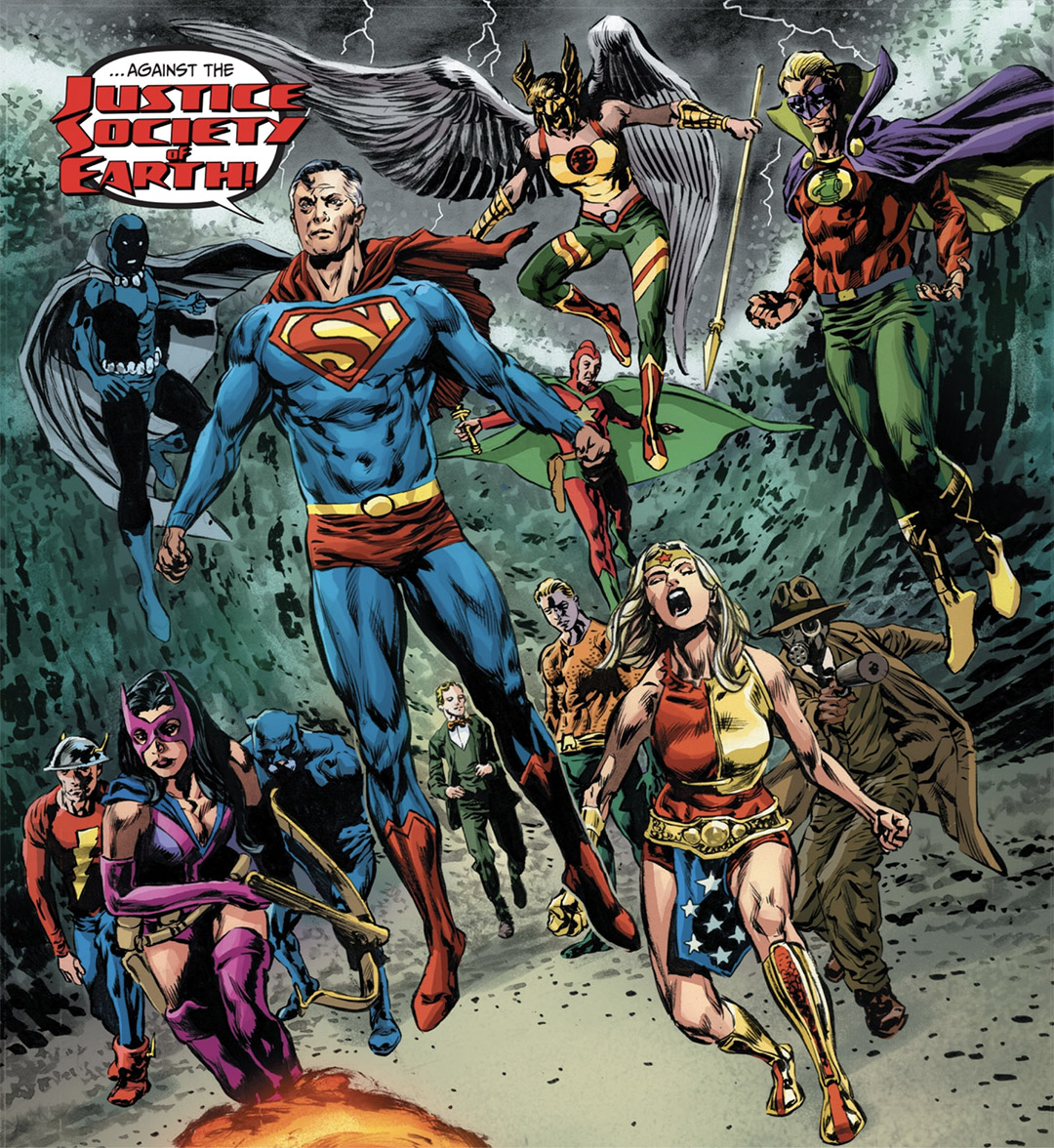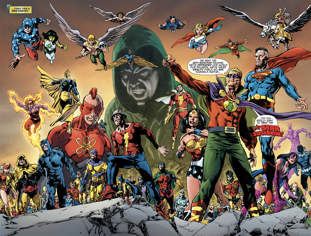 After the surviving worlds are merged following the Crisis, the Justice League of Earth-One is killed in battle with the evil god Surtur. (In canonical continuity, the JSA were the ones who disappeared fighting Surtur after the Crisis). The Justice Society thebn rallied with a legion of All-Stars and confonted Surtur but this battle was futile and most of their number were lost (including the Spectre).