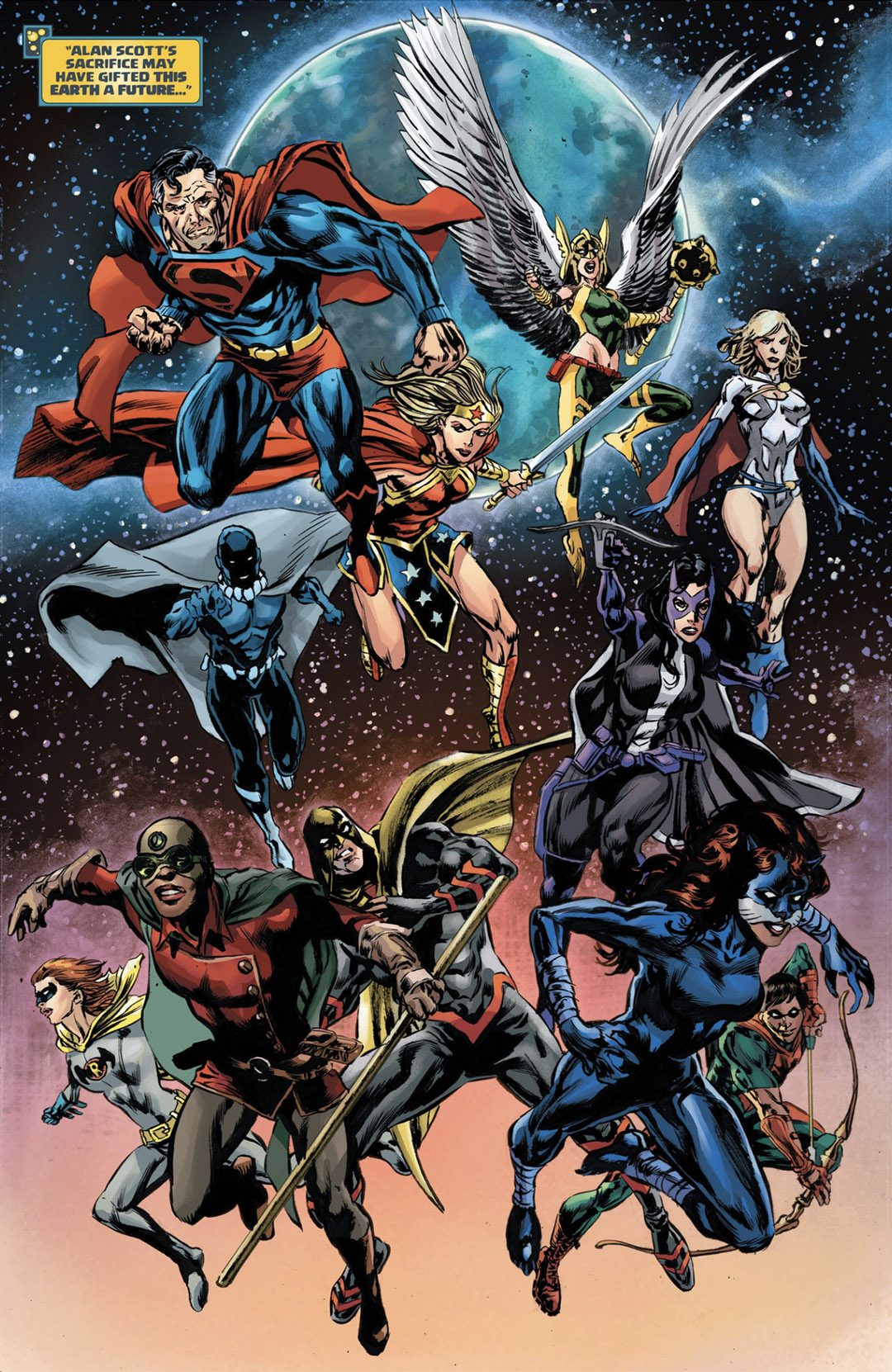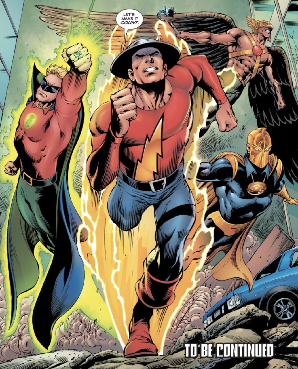 Both groups of heroes ultimately accepted their potential destruction and agreed to a stalemate. They could not bring themselves to kill their opponents. Dr. Fate came to them and called them back to Metropolis, where the aged members of the Justice Society had convened. They had likewise fought beings from another city but now decided to retire. They asked the Infinitors to become the new Justice Society. Star proposes the name "JSA-Infinity." (#2)