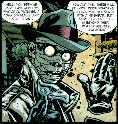 In this "universe," the Justice Society is a loose term used to describe a network of 52 groups of adventurers (whose missions sometimes intersect). Skull introduces a number of British heroes, both super-powered and non-, who work for a network called the Skeleton, an agency Teagle and Sons, run by Mr. Teagle and Dr. Archibald Moon. (#2) The Whistling Skull is a British operative who possesses the memories of his predecessors. His horrible visage is not supernatural, but a mask. (DC's original Dr. Moon first appeared in Batman #240, 1972).