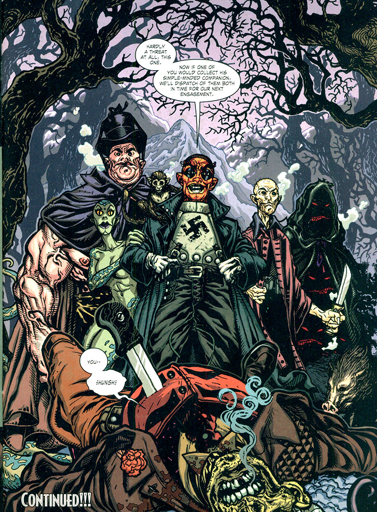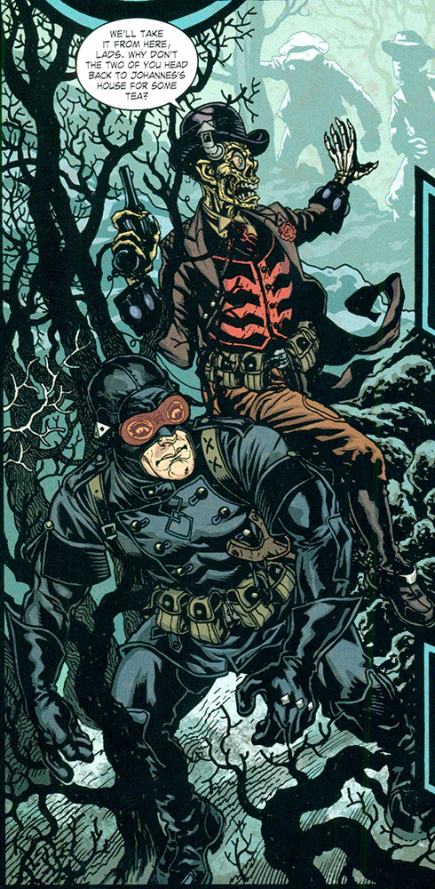 The boys found Hellman's laboratory but the villain escaped. In their inevitable clash, William took a knife to the chest and one of Hellmanm's monsters turns out to be Johannes's brother, Viktor. (#5) To help him win against Hellman, the Skull recieved help from another (unnamed) agent. From this agent's lab inside Big Ben, William was given a teleportation device in the form of a pocket watch. It could only use once, and the watch allowed the Skull to gain the upper hand against Hellman, who was finally captured. En route to his incarceration, Hellman's train was stopped by the Gestapo and he went with them.