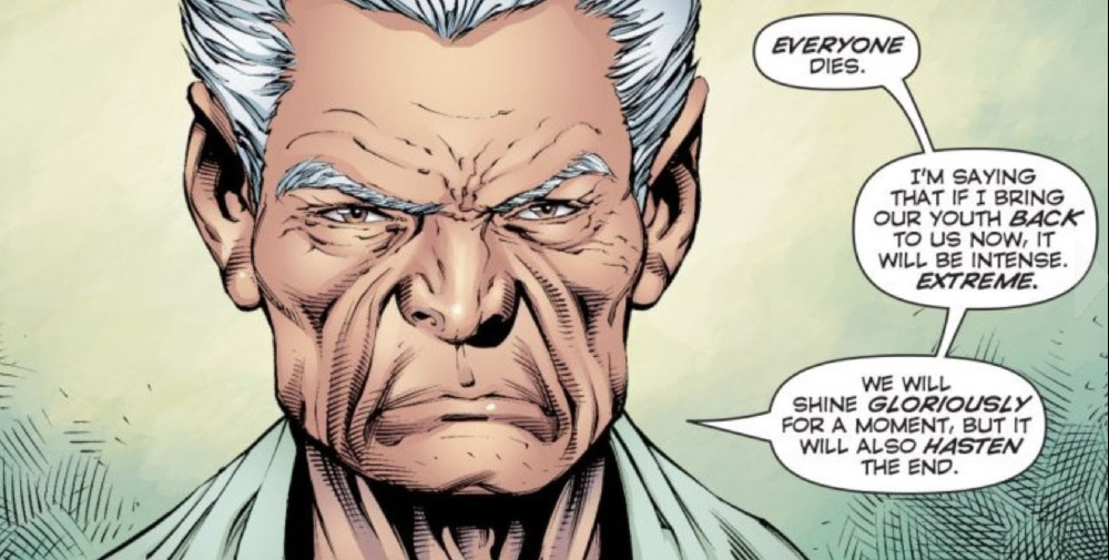 The Shining Knight's magical youth had faded away, buot was restored when the cities of Telos were ultimately freed. He led the charge against the Weaponers from Qward. The Crimson Avenger and Vigilante also fought them, and died. (#2)