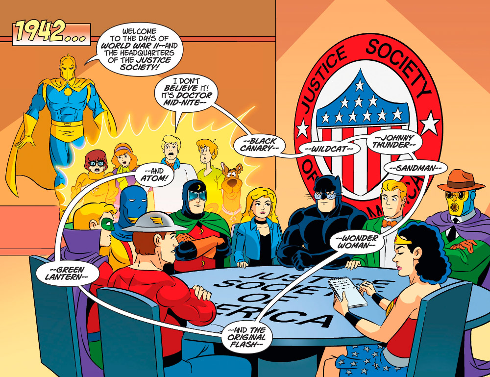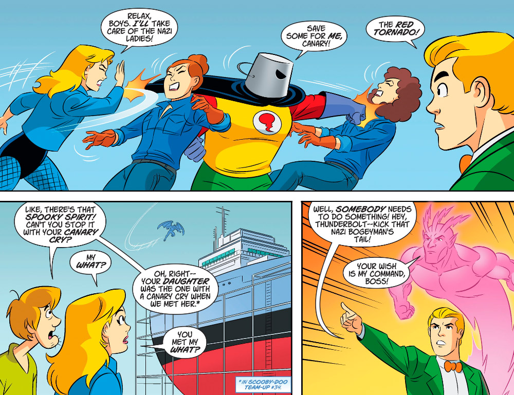 Dr. Fate brings the Scooby Gang to 1942 to help the JSA. From Scooby-Doo Team-Up #77 (2018); by Sholly Fisch and Dario Brizuela.The Red Tornado joins in the fight against Vandal Savage and Nazis. From Scooby-Doo Team-Up #78 (2018); by Sholly Fisch and Dario Brizuela.