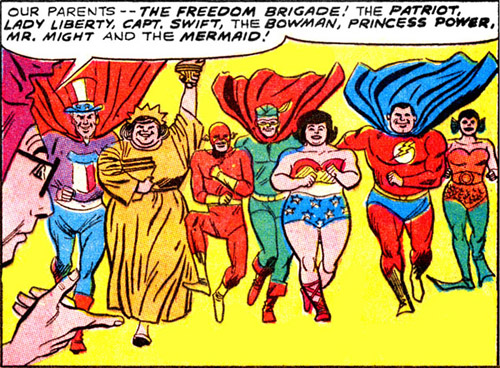 The Freedom Brigade appeared only twice. In the first story, they coaxed their offspring to band together as the "Inferior Five." In the second, they served as teachers at Dean Egghead's Academy for Superheroes (a parody of Marvel Comics' Professor X and the X-Men).