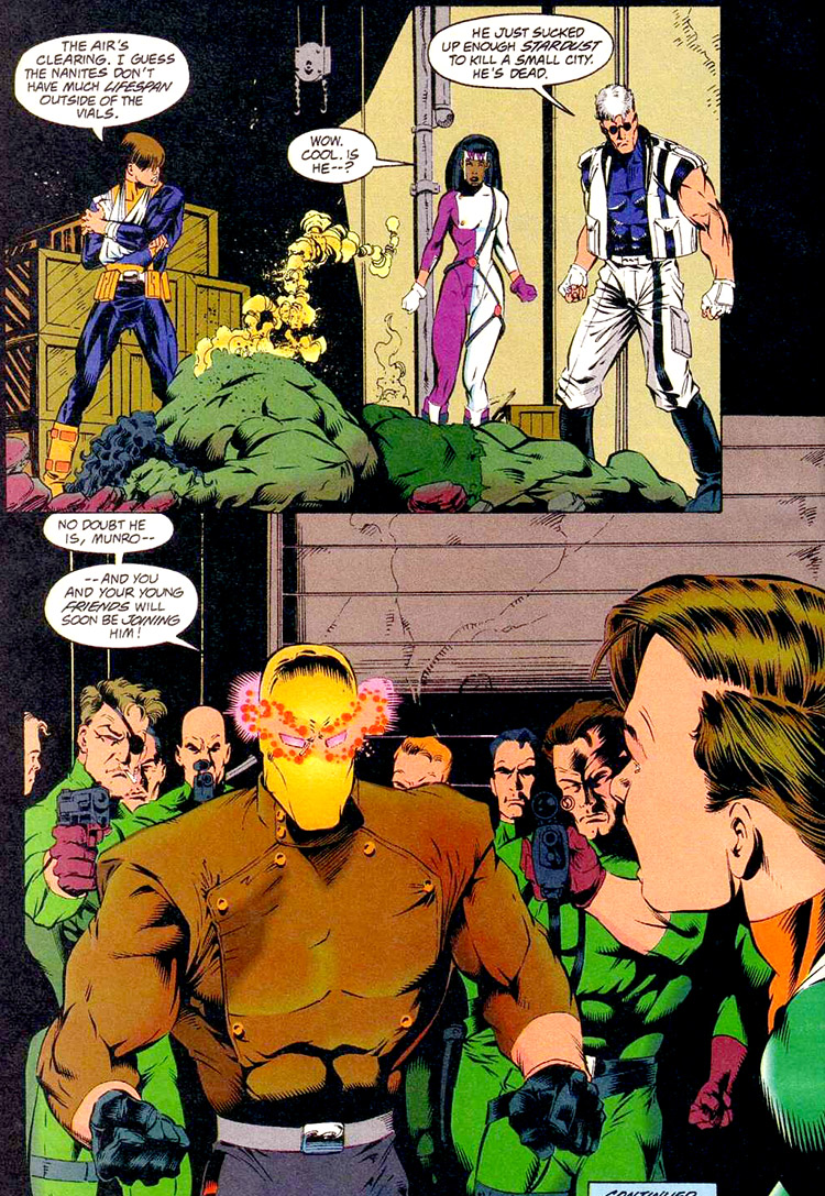 The Wahrman also used Abriam's adopted daughter, Gillian, as an operative called Wyldheart. She was sent to step in between Grant (now calling himself Damage) and the Symbolix monster Troll. In other dealings, Abriam Wahrman contracted with the Baron (Blitzkrieg), who was helping distribute an experimental drug called Stardust. (#3) Iron Munro tracked down the Baron about the same time that Damage and Wyldheart stumbled upon the same, looking for shelter. (#4)