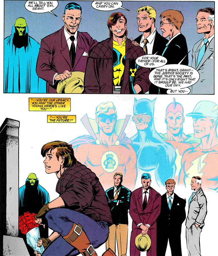 Under the watchful eye of the surviving members of the Justice Society. From Damage #15 (1995); art by Bill Marimon and Don Hillsman.