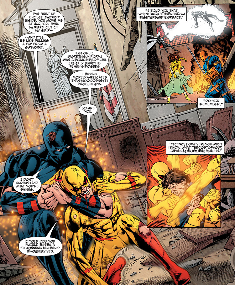 During his time with the Justice Society, Grant's disfiguration greatly tarnished his personality. He was prone to outbursts and rebellion. The team helped him find justice for this, and pursued Zoom into Georgia—where there was restraining order against Damage. Green Lantern tried unsuccessfully to stopped Grant from entering the state. Damage took Zoom hostage and it was up to Liberty Belle to talk him down. She disabled Zoom by using her own speed powers to access the Speed Force. In the aftermath, the entire JSA stood behind Damage against law enforcement, who want to take him into custody. (#8)