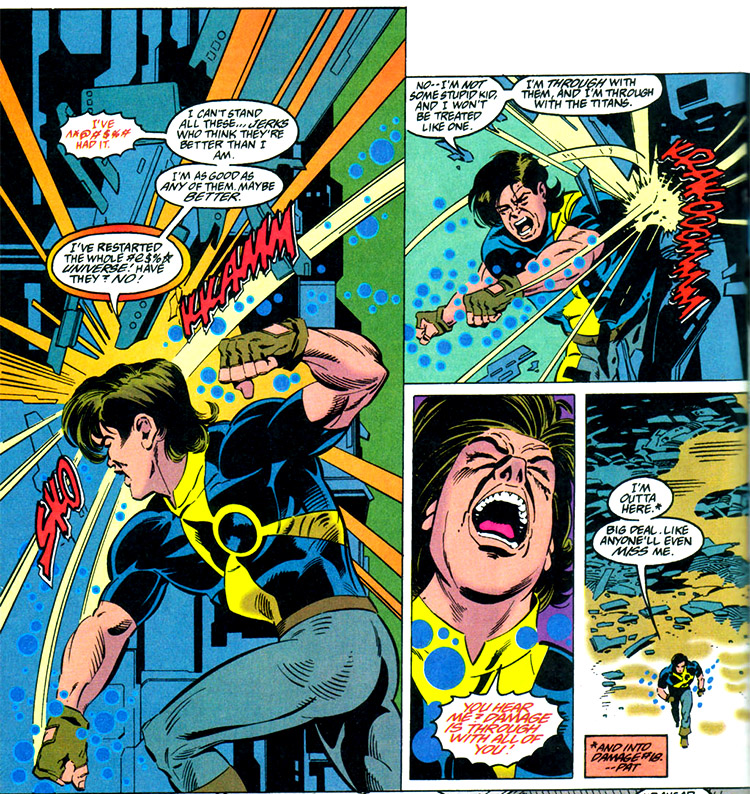 Damage continued to train with the Titans, but never quite fit in. He bristled at Arsenal's attempts to discipline him, and complained about unfair treatment. Despite this, he formed friendships with fellow Titans Green Lantern (Kyle Rayner) and Impulse. Green Lantern defied the Georgia court order and escorted Grant to the funeral of Mandra Darrow. (#13)Damage went with the Titans into space to help the Council of Zi Charam (#16, New Titans #124-125), but his attitude continued to cause friction with Arsenal, who sidelined him from a different mission. Grant threw a tantrum and quit the team. (New Titans #127)