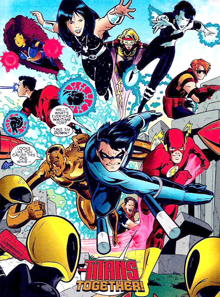The original Titans reform as a team of mentors. From The Titans #1 (1999); art by Mark Buckingham and Wade Von Grawbadger.