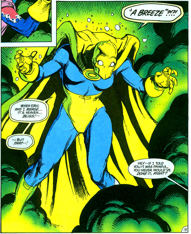 Eric became dreadfully ill from his transformations into Doctor Fate. In desperation, Nabu urged Linda to form Fate by herself—which was possible but very painful. She would also not be as powerful. Linda teamed with Deadman and a mystic called Indra to again defeat Joaquim Hesse again. (#8)