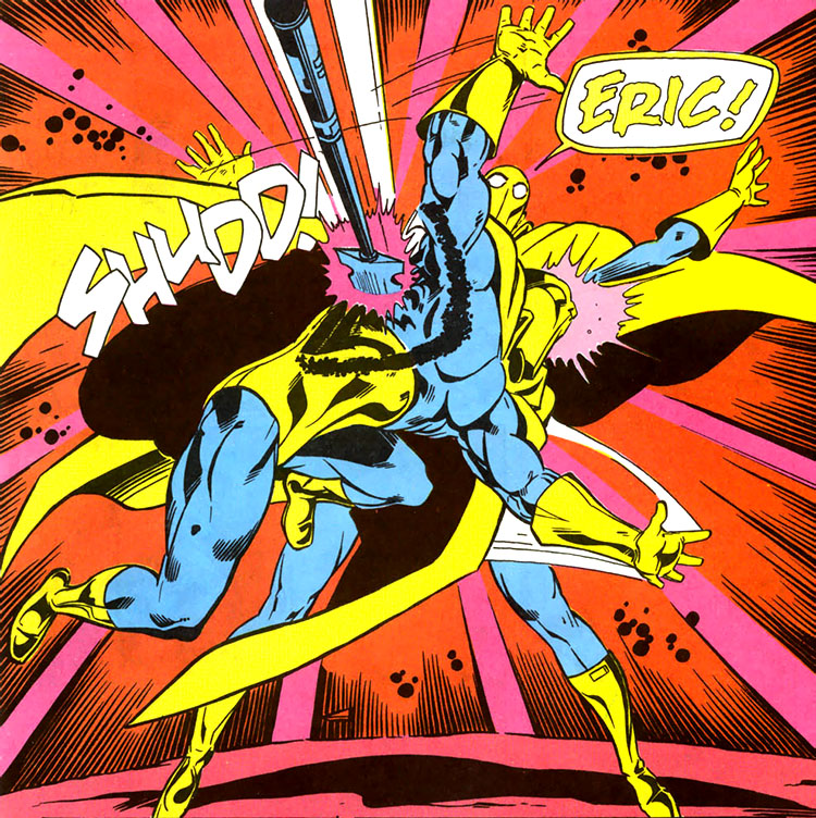 From Apokolips, Darkseid took note of the new Doctor Fate on Earth and summoned the Lords of Order and Chaos, and saying they would both gain if Fate were destroyed. (#10) Darkseid went to Earth and Eric was forced to make the painful solo transformation into Fate, but Darkseid transported Eric to Apokolips. Linda was simultaneously able to become Fate, and found him there. (#11) To save Linda's life, Eric took a spear to the chest and he died in her arms. (#12)