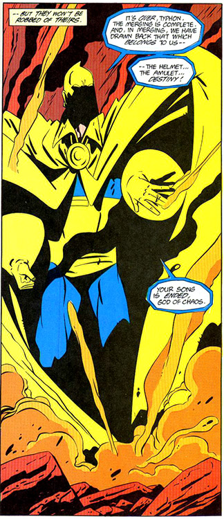 During this time, the Lords of Order wanted to end the universe prematurely and chose the vampire Andrew Bennet to carry out this task. If Bennet succeeded, the Lords of Order would release him from his curse. (#2) Fate and Nabu opposed the Lords' plan and struck an uneasy alliance with Typhon to prevent this. In India, Bennet was to play a flute that would cause Mahapralaya, the all-embracing Sleep of Brahma, the end the universe. During their uneasy alliance, Typhon haunted Eric's mind so that he could not think straight as Doctor Fate. As a result, Linda took control of the transformation and became the first female Doctor Fate. (#4) They were unable to stop Bennett from playing the flute, and the universe blinked out of existence. (#5) But with Fate's intervention, this was quickly reversed and Typhon was banished back to the realm of Chaos. (#6) NOTE: When Linda took control of Fate, it usually involved Eric in the matrix as well. Regardless of whether both or one of them were Doctor Fate, Cosmic Teams treats both incarnations as "Doctor Fate II."