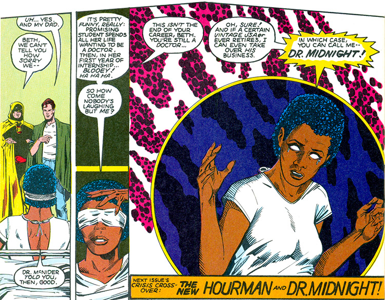 Chapel returned home to Orangeburg to recover. It was difficult; her father was a minister and she had left the church long ago. As Hourman II, Rick Tyler came to her family home and met her brother, John. He said that the Justice Society and Infinity had disappeared. This was during the first Crisis, and soon she and Rick were beset by the shadow demons of the Anti-Monitor. Her life was on the line and she prayed for her sight to return. Fate intervened and in the darkness of the shadow creatures, Beth found that like Charles McNider, she too could see in the dark. They drove off the shadows and when her parents returned home, she told them everything. Her mother helped create a costume for Beth, but her father disapproved of her decision to become Doctor Midnight. She left immediately with Hourman. (#21)