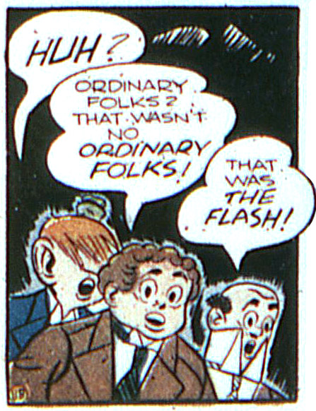 Jay appeared never too concerned for his secret identity. When the Flash exonerated Joan Williams's father, Major Williams, of espionage charges, the Major also learned that the Flash was Jay Garrick. (#3) His feature co-starred the Three Dim-Wits They first appeared in All-Flash #5 (1942), as incompetent small-time criminals working for a crooked stable owner. After the Flash captured the stable owner, the three henchmen decided to move on to more benign pursuits. The trio wandered from job to job, usually getting into trouble or causing it, and the Flash would always get involved.