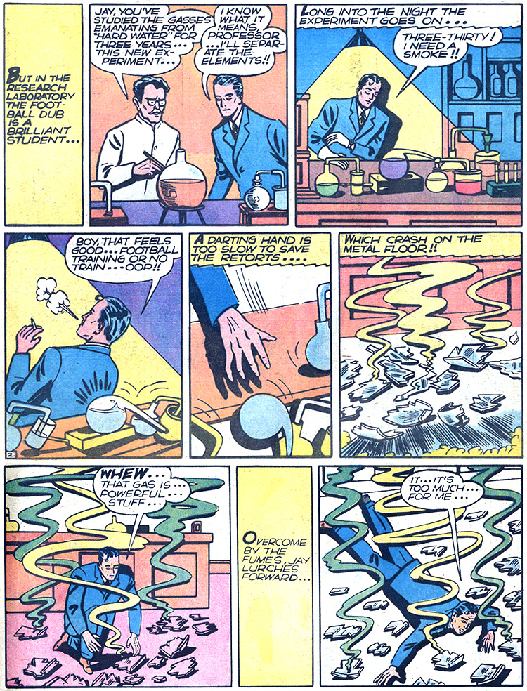 Jay Garrick meets Joan Williams at Midwestern University, he asks her to a dance but she rebuffs him, having accepted from a football player already, Bull Tryon. On the field Jay is known as a leadfoot. Later in the lab, he studies "hard water. Late at night he gets clumsy spills his chemicals. Breathing in the gas, he passes out, Professor Hughs finds him unconscious, brings him to hospital. He lies for weeks but is very healthy when he wakes. The doctor deduces that Jay has become "the fastest thing that ever walked on earth!!" Jay rushes out stunningeveryone, he toes to see Joan and others, appearing and disappearing, and uses the power on the football field too. Later Joan sees him playing tennis with himself, he learns her father has been kidnapped. Sieur Satan heads up some racketeers called the Faultless Four and targets joan but Jay is faster than a bullet. He works with Serge Orloff, surgeon; Duriel the assassin; Smythe. They want to steal some atomic secret invented by Major Williams. Jay departs saying it looks like a job for the Flash (though he's never been seen before). Costume includes yellow bolts on the pants. When he rescuyes the major he doesn't recognize Jay. Hard to breath when carried by Flash. The Flash listens to the Four's next plan, he makes quick work o fthem, sending Satan off a cliff. In the end Joan winks at Jay; she knows his identity. 1