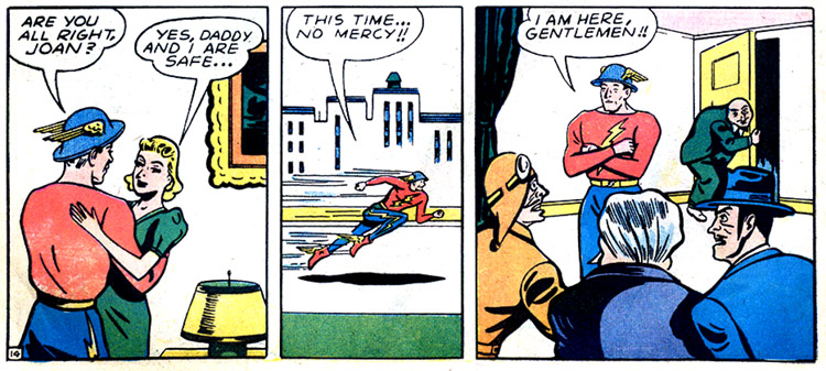 The Flash comforts Joan Williams then races off to take care of Sieur Satan and the Faultless Four. From Flash Comics #1 (1940); art by Harry Lampert.