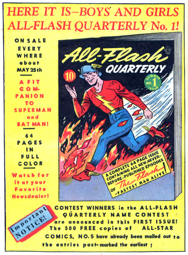 The readers had reportedly spoken — the Flash was the third DC character awarded his own solo title. All-Flash Quarterly ran for 32 issues (1941–1948).