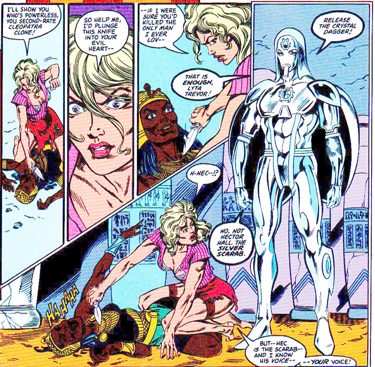 After the great Crisis, the JSA entered another dimension for an indefinite period of time, and Lyta discovered that she was pregnant. (#32) But what should have been a happy news was overshadowed by a growing evil inside of Hector. Before they could marry, Hector fell victim to an evil entity that had remained dormant inside his body since birth. This was a curse placed by Hawkman's ancient foe, the Egyptian called Hath-Set, a high priest of Setekh. Hath-Set forced this entity—the original "Silver Scarab"—into Hall's body. The Scarab battled with Infinity Inc., who were forced to destroy it, and Hector along with it. (#38-44)