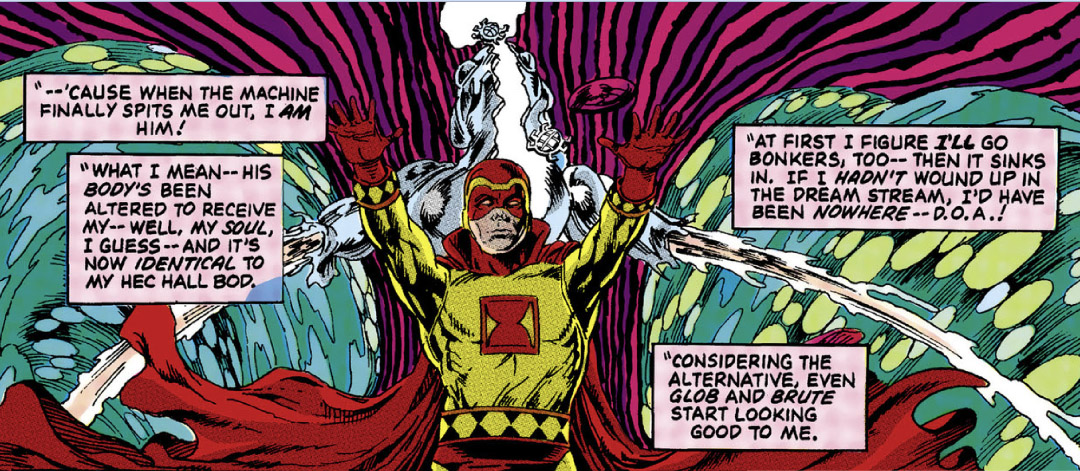 Infinity could not save Hector but unknown to Lyta, Hall's essence was cast into the Dream Dimension where it was enslaved by Brute and Glob, renegade servants of Dream of the Endless. These beings attached Hall to a specialized machine that programmed him with information about the machine's owner, the former guardian of the Dream Dimension, Dr. Garret Sanford, a.k.a. the second Sandman. (#49) The immense strain of living in the Dream Dimension had driven Sanford to his death. While Sanford's body remained in stasis, the machine transferred Hall's consciousness into it and changed the body's appearance to match that of Hector Hall. Brute and Glob transformed Hector into the new Sandman (III). At night, the Sandman would visit Lyta while she slept. Their teammate, Nuklon soon discovered this and unmasked Hall in front of her. She and Hector married as they had originally intended and left for the Dream Dimension. (#51)