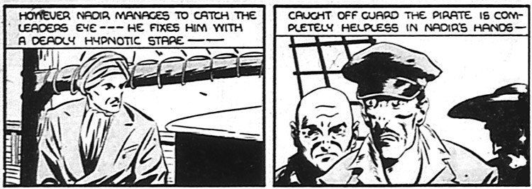 Duprez was double-crossed by his own bodyguard, Job, who locked Nadir in a stone cell. (#19) Arcot rescued his master and they used the crystal again. (#20) Their chase took them onto the seas, (#21) where Nadir was forced to swim to safety (he doffed his turban in order to "avoid questioning"). (#22)