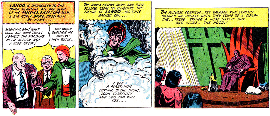 On an adventure to Central America, Lando took on foreign interests that sought to seize the Panama Canal. Their leader, the Hood, sicced his own witch doctor on Lando. The two used their powers to shrink each other, and produce snakes and lions, but Lando won out by trapping the Hood's boat in frozen water. (#3)