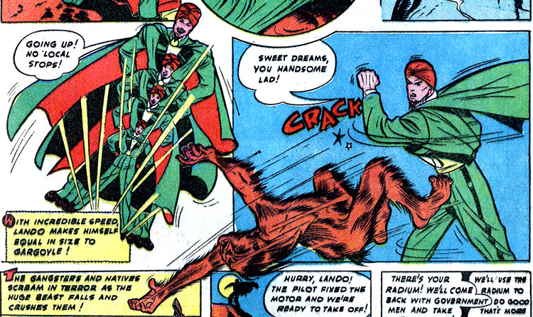 "Lando the Unknown" was a touring magician who possessed legitimate supernatural powers. When he went on vacation, he was approached by a woman who had news of spy activity on a nearby mountain top. The next day they both embarked for the mountain. When Lando was double-crossed by their guide, he effortlessly floated into the air to avoid harm. He flew to the summit then instead, and engaged with an Asian man, turning him into a duck. Lando also made himself invisible, immobilized a guard, and ultimately transformed all the enemy planes into junk. (World's Best Comics #1)