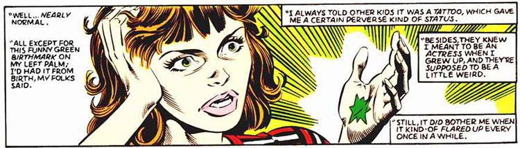 Jade is the daughter of the original Green Lantern, Alan Scott. She and her twin brother, Todd (Obsidian), were conceived by Scott and a young woman named Alyx Florin. Unbeknownst to Alan, Florin suffered from multiple a personality disorder; she was also the former villainess, Rose Canton a.k.a. the Thorn. (Flash vol. 1 #89) Not long after the twins were conceived, Rose left Alan without a word. She had the children in secret, left them up for adoption, and disappeared. Jennie and Todd were raised separately, by two sets of adoptive parents and did not meet until adolescence. Jennie was raised by Julian and Myrna Hayden. NOTE: Although Jade was usually depicted with green skin and hair, this was only the effect of her powers. When "powered down," she appeared like a normal human being.