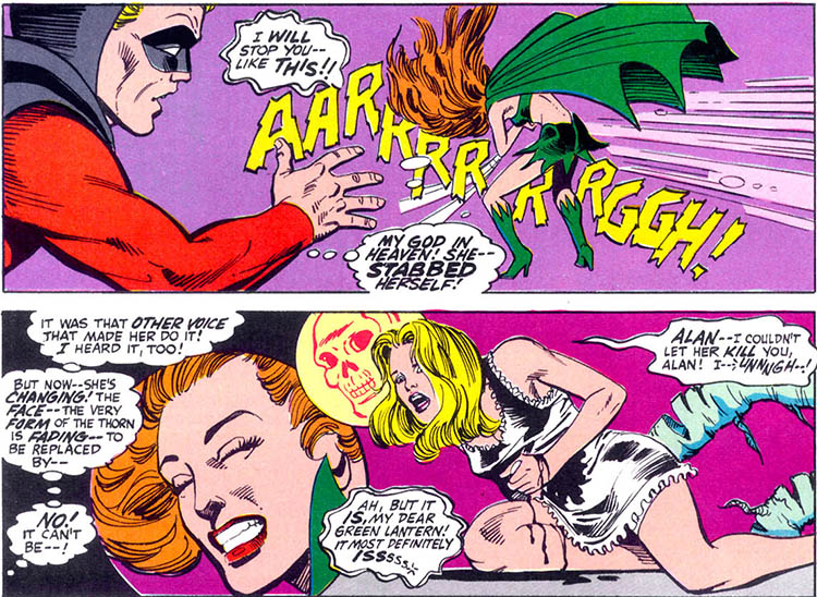 During the melee, Thorn's good personality (aka "Rose") briefly regained control. Rose stabbed herself to prevent the Thorn from killing her children. Before she died, she revealed that she was Alyx Florin, Alan Scott's former wife, and Jade and Obsidian's mother. The Harlequin also then revealed her true identity to them and professed her long unexpressed feelings for Alan. Alan and Molly were soon engaged then married. They were happy to accept Jennie and Todd as their own children, and their bond has grown stronger. (Infinity Inc. Annual #1)