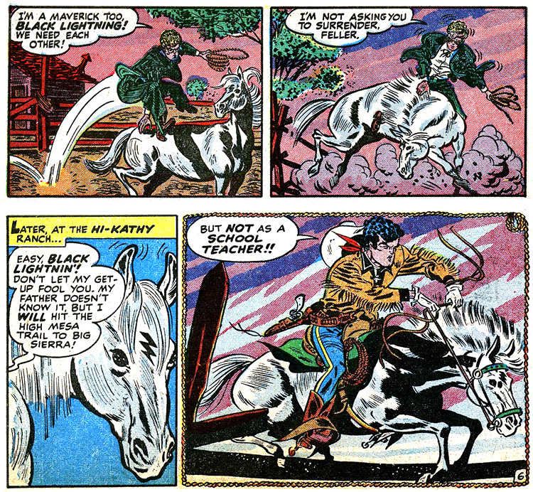 This Johnny Thunder was secretly John Tane, a schoolteacher in the Old West town of Mesa City who adopted a secret identity to fight outlaws without technically breaking his promise to his dying mother that he would not take up the gun like his sheriff father. Like the earlier Johnny Thunder, Tane had blonde hair and wore a green suit, but he dyed his hair black when he went into action. Tane had no powers other than his amazing skill with the six-gun, but his horse, Black Lightning, had a distinctive lightning bolt mark on his forehead!