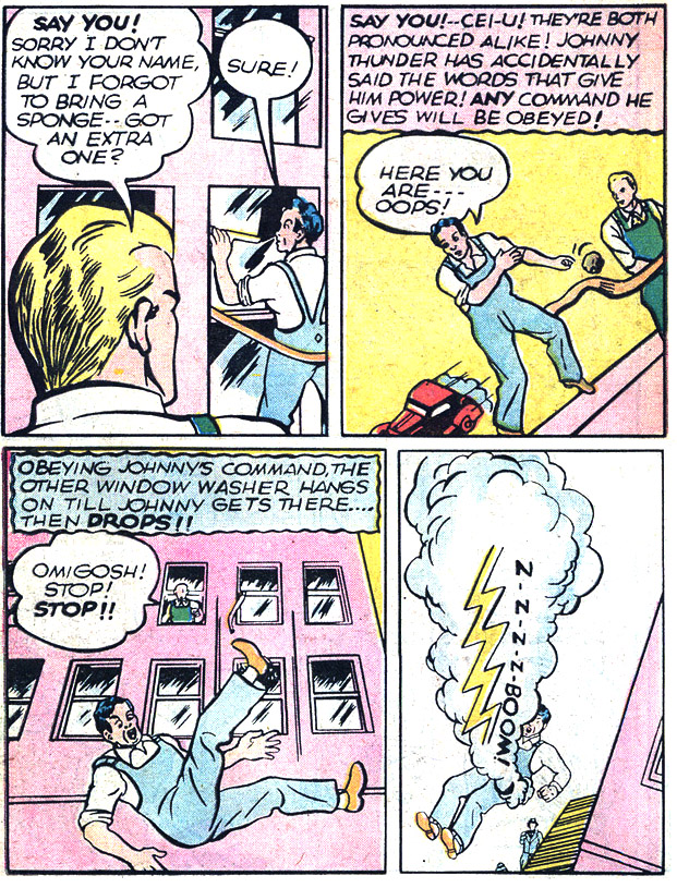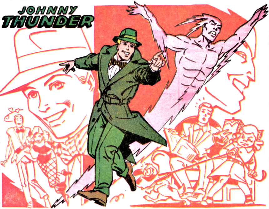 Johnny Thunder was introduced in Flash Comics #1 (Sept. 1940), at the same time as the Flash and Hawkman, as much a comic figure as a super-hero. Johnny was a well-meaning but dunderheaded young man who could command an awesomely powerful djinn-like being called the Thunderbolt, by saying a magic word.
