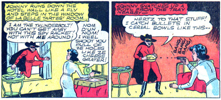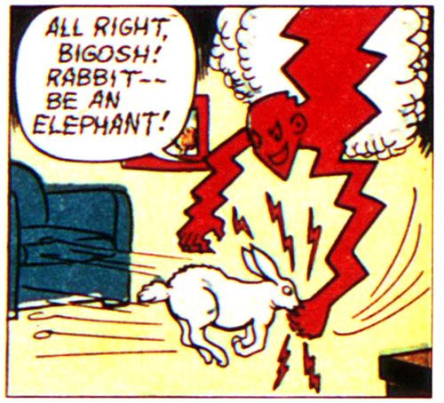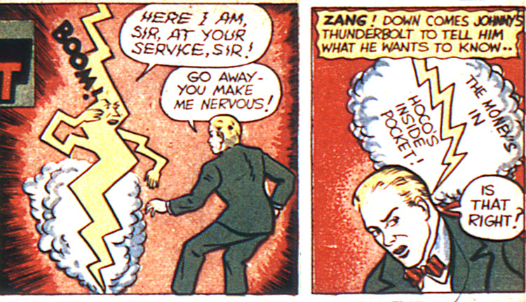 The first indication of this being came when Johnny heard the Thunderbolt inside his head, telling him what he wanted to know. (Flash Comics #8) Note: The introduction to this story actually depicted the Thunderbolt for the first time. It read, "Johnny has a personal Thunderbolt that enforces his every command for the next hour." It depicted the creature as a yellow bolt with a face and arms saying, "Here I am, sir, at your service, sir!" But it did not appear as such in the story.