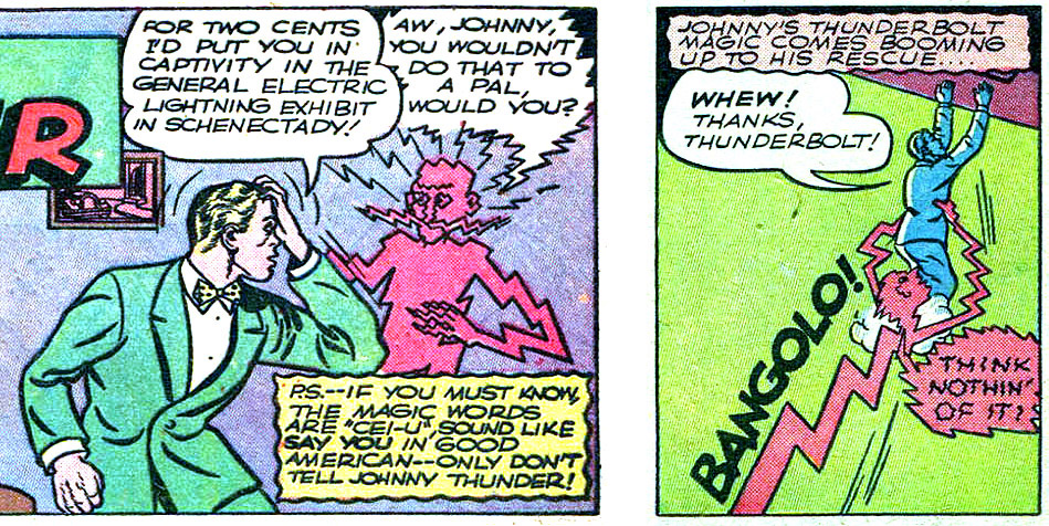 Johnny did not have any powers of his own except the ability to command the Thunderbolt, a djinn (or genie) from the Fifth Dimension (also home to Superman's nemesis, Mr. Mxyzptlk). Speaking the appropriate magic word — originally "Cei-U" ("say you"), later "so cool" — summons the Thunderbolt, who will do their bidding for one hour before returning to his home dimension.