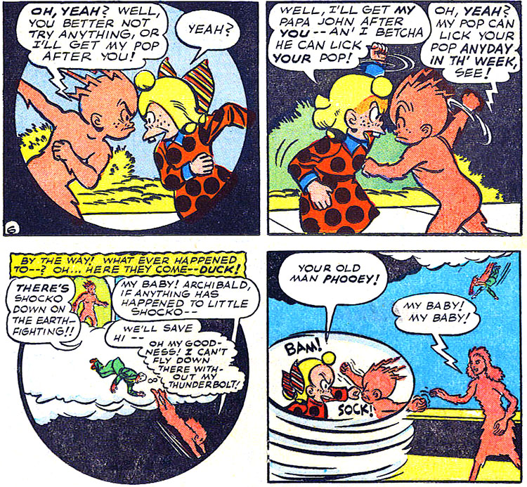 The Thunderbolt was known to have proper parents (Flash Comics #42), and in his native dimension, he married and bore a son, Shocko. Shocko later met and befriended Peachy Pet. (#69) Peachy Pet learned that she could summon Shocko by saying her own magic words, "sez me." (#71) The children later had several adventures together. (#73, 75, 80) Note: Thunderbolt and his wife called each other by names like "Mildred," "Archibald" and "Oswald," which were probably nicknames, inspired by American culture.