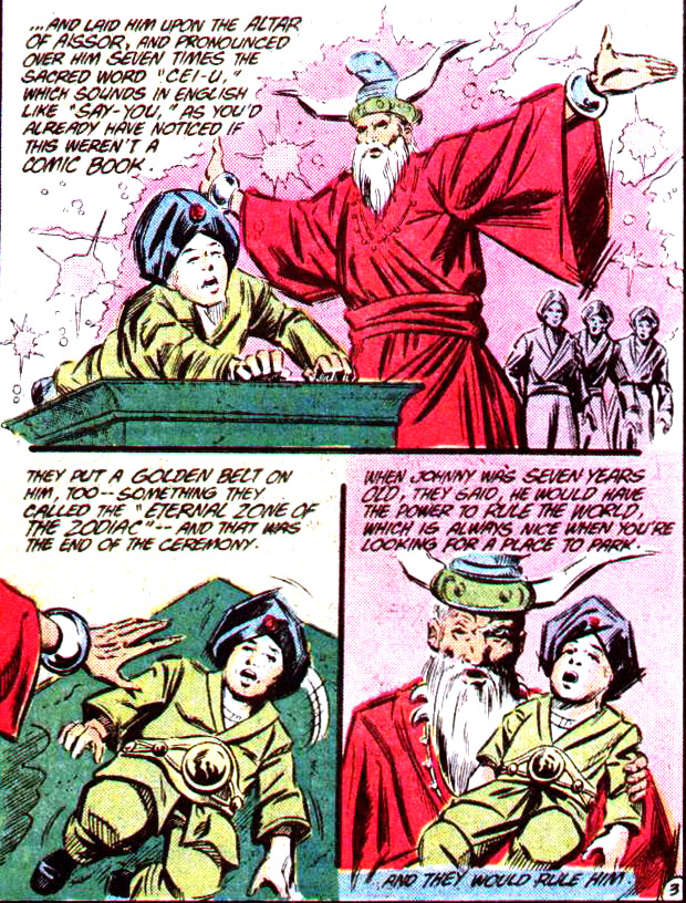 When he turned seven, Johnny's magical power began to manifest, although neither he nor his parents were aware of this, or knew the meaning of the odd golden zodiac belt that Johnny wore. As he grew older, strange, improbable things would happen around him, sometimes accompanied by glimpses of a curious pink Thunderbolt. Johnny had not yet realized that he was calling magic energy by speaking the words "say you" — a homophone for "Cei-U" — the magic word the high priest had chosen to activate Johnny's powers.