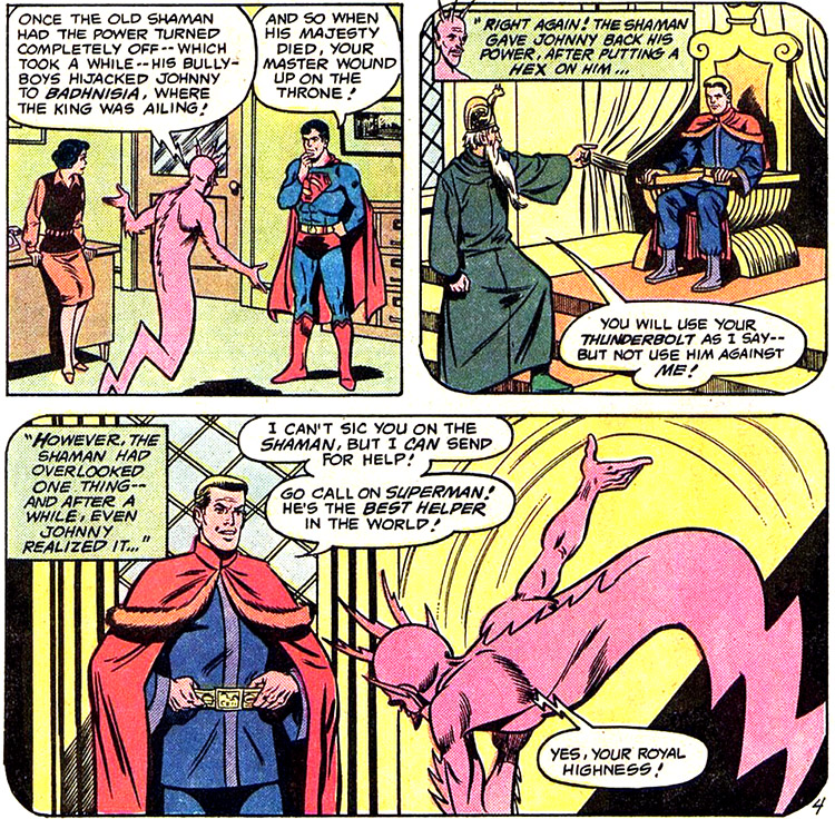 In the early '50s, sometime after the death of Simon Thunder, the shaman's agents kidnapped Johnny and took him to Badhnisia, where he was crowned king. The shaman returned Johnny's zodiac belt, giving him back his power over the Thunderbolt, but cast a hex to prevent Johnny from using the Thunderbolt's power against the shaman. The old priest intended to use Johnny as a cat's paw in the conquest of Badhnisia's neighbors, but, in a moment of clarity, Johnny sent the Thunderbolt to America to find a hero who could help him defeat the shaman. The Thunderbolt approached Superman, but, since Superman was vulnerable to magic, he and his wife, Lois Lane Kent, arranged a ruse to trick the shaman into giving up his power. Although Johnny was now free, he decided to remain in Badhnisia to teach the natives about democracy. (Superman Family #204)