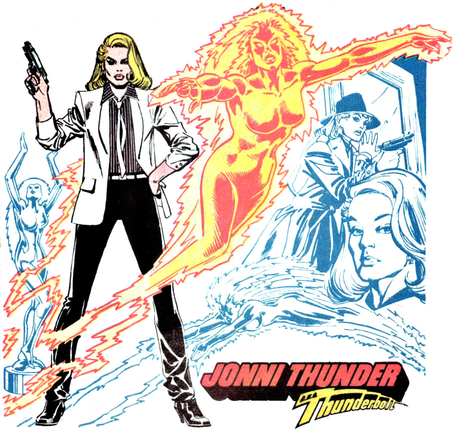 Jonni Thunder was a "hard boiled" private eye from Los Angeles (on Earth-Two). She was transformed into a living lightning bolt by a mysterious statuette while investigating the murder of her father, LAPD detective Jim Thunder. (Jonni Thunder #1)