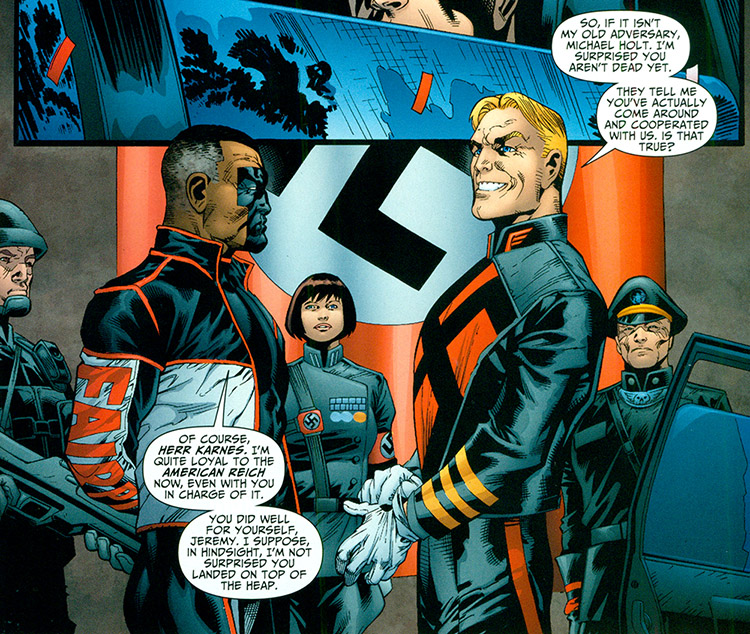 Karnevil remained in the custody of the JSA for a time (#34) until he was freed by Captain Nazi and his new Fourth Reich. (#36) In their attack, the Reich seized the Obsidian egg. Their machinations resulted in the death of many heroes and removed the powers of those who remained. Karnevil was installed as their new Führer and his American Reich lasted for twenty years. Karne kept his arch foe, Mister Terrific, alive for years. Holt could have killed him many times, but chose instead to organize a resistance. (#38) His plan involved sending a message back in time, to himself, to hatch the Obsidian egg and free the hero inside. Doing so averted the Reich's plan and the reign of Karnevil, who was again taken into custody. (#40)