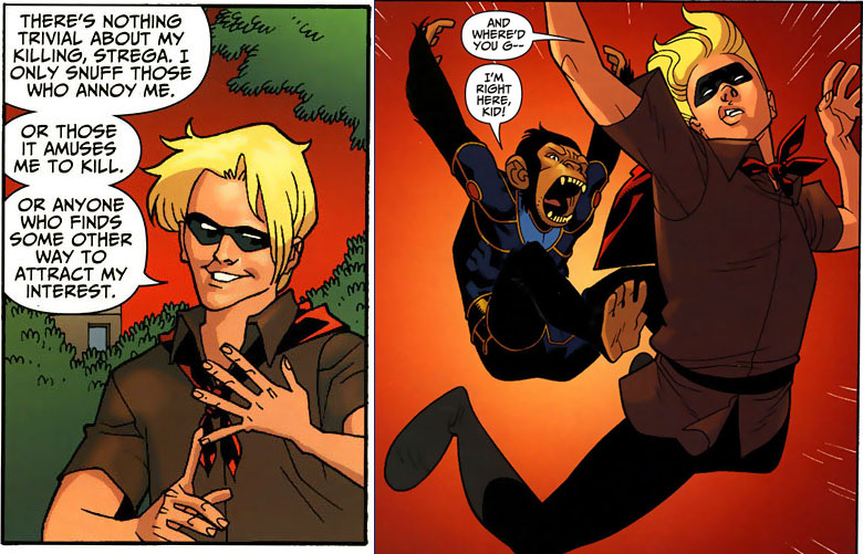NOTES: Kid Karnevil's real name was revealed in Shadowpact #13 (2007). In his first appearances he was called simply "Karnevil." In Shadowpact #13 it became Kid Karnevil. He has appeared only in books penned by his creator, Bill Willingham.