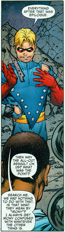 Karne struck out on his own and the next time he appeared, he was in the service of the secret new Fourth Reich (led by Captain Nazi). They sent him undercover to become a member of the Justice Society, where Karne invented the persona of "Billy Armstrong, the All-American Kid." His story was that his great-uncle was the original Mister America and that for a short time during that hero's undercover mission in Germany, Tex Thompson had a partner—the original All-American Kid. Karnevil also called the original Kid his uncle, William. He began training himself when he learned the JSA had opened their ranks to legacy heroes. NOTE: There has never been a World War II-era All-American Kid, in the Golden Age or any other period.