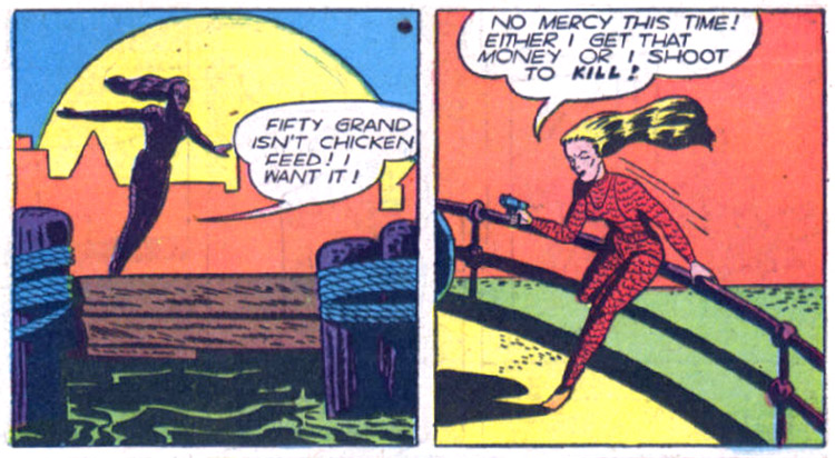 The King encountered only a few other super-villains. The Scarlet Mermaid targeted the wealthy owners on their yachts. After making a grab, the slender blond leapt into the river and disappeared. The King trailed her to shore and reclaimed her spoils. To capture her, he took a bullet in the shoulder but still managed to swim after her and bring her in. (#19) And the Murder Master was a costumed villain, who wore a very strange bug-like scarlet mask and devised unusual ways of killing people which he considered his "art." (#36)