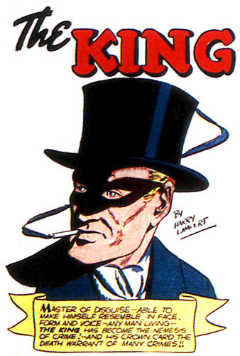 The King was "the man of a million masks," an early feature in Flash Comics. His inaugural six-page episode in Flash Comics #3 (Mar. 1940) was titled "King Standish." It changed to "The King" with issue #16 (Apr. 1941). These stories never revealed whether "King" was this mystery man's true first name, but the character's profile in Who's Who #12 (Feb. 1986) listed the name using quotation marks. His son, King Chimera, also referred to his father's name as if it were a nickname. Regardless, there were never any clues given to the man's origins or background. The character was only occasionally drawn wearing his signature top hat, mask and tuxedo; he was usually in disguise. The King made only one cover appearance, Flash Comics #5 (May 1940).