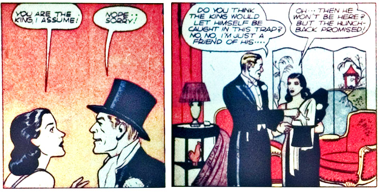 Readers met the King fully formed, a wealthy master of illusion who perpetuated the rumor that he was a thief in order to draw the criminal element. In the first episode Boss Barton ordered his gal Myrna Mallon to find the King. All she knew was that the King was wealthy and wore disguises, so she ventured into the seedy part of town to engage one "Hunchback Harry." She asked Harry for a meeting with the King that night—never suspecting that Harry was the King! The storytelling in these early episodes was fairly disjointed, with the King and others changing costumes and faces too quickly, leaving the reader disoriented.