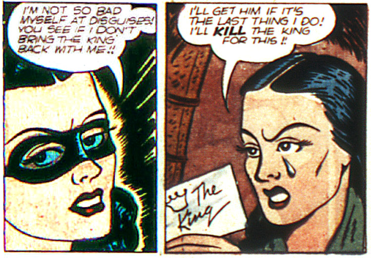 It looked as thought Myrna might become a fixture, but she replaced by a different woman called the Witch, the King's first costumed foe. The Witch became the costar of the King's feature, appearing in most episodes. She began appearing in the "roll call" of the splash panels in Flash Comics #28. This wily brunette wore a domino mask in her first appearance (only) and was also adept at disguise. Mostly she was a thief whose schemes lured the King. When they first met, he impersonated one of her men and accompanied her back to her apartment. He confiscated her stolen jewelry but chose not to turn the Witch in because she was "much too exciting to go behind bars." The King hoped to reform her while she found herself likewise attracted. (#5)